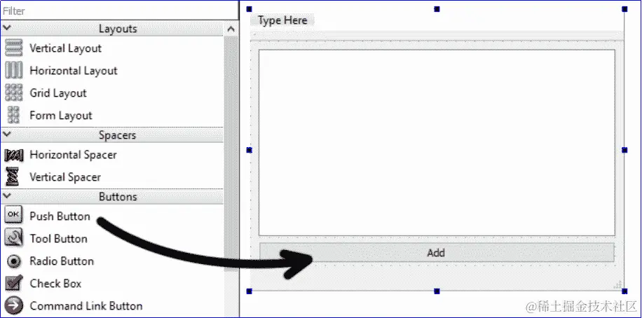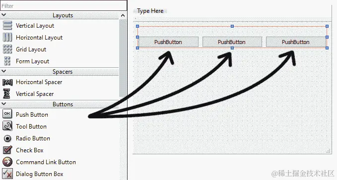 然后,在水平布局中添加两个按钮和一个水平间隔以使它们右对齐: