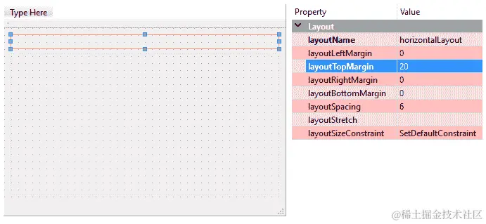 然后,您会看到顶部布局小部件现在非常窄。让我们暂时将其高度设置为20,如下所示: