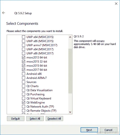 新的 WebEngine 模块是基于谷歌构建的Chromium框架,它只能在 Windows 平台上的Visual C++编译器上运行。因此,如果你在运行 Windows,确保你已经在你的计算机上安装了Microsoft Visual Studio以及与你的计算机上安装的 Visual Studio 版本匹配的 Qt 的MSVC组件。除此之外,这个特定章节还需要 Qt WebEngine 组件。如果你在 Qt 的安装过程中跳过了这些组件,你只需要再次运行相同的安装程序并在那里安装它: