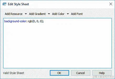 接下来,再次右键单击 QFrame 并选择更改样式表。将弹出一个窗口来设置该部件的样式表。添加以下样式表代码以使背景变为黑色: