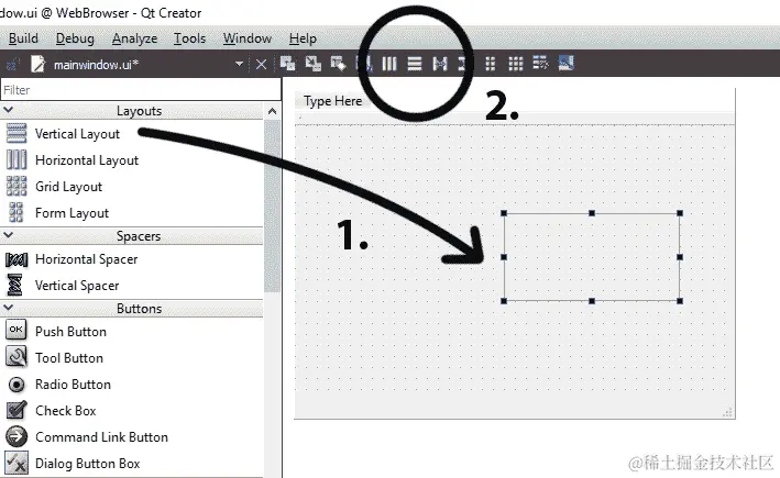 接下来,我们将把它变成一个合适的网络浏览器。首先,我们需要添加一些布局小部件,以便稍后可以放置其他小部件。将垂直布局(1)拖放到 centralWidget 上,并从对象列表中选择 centralWidget。然后,点击位于顶部的 Lay Out Vertically 按钮(2):