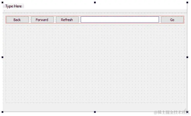 将按钮的标签分别设置为Back、Forward和Refresh。您也可以使用图标而不是文本显示在这些按钮上。如果您希望这样做,只需将文本属性设置为空,并从图标属性中选择一个图标。为了简单起见,我们将在本教程中只在按钮上显示文本。