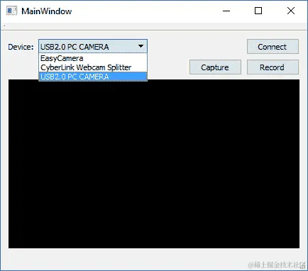 现在构建并运行项目。之后,检查调试输出以查看计算机上检测到的摄像头。检测到的摄像头也应显示在下拉框中。如果您在支持摄像头的笔记本电脑上运行,您应该能够看到它在列表中。如果您在没有内置摄像头的系统上运行,则调试输出可能不会显示任何内容,下拉框也将保持为空。如果是这种情况,请尝试插入一个廉价的 USB 摄像头并重新运行程序: