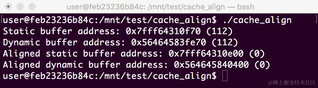 printf("Aligned static buffer address: %p (%d)\n", aligned_static_buffer,