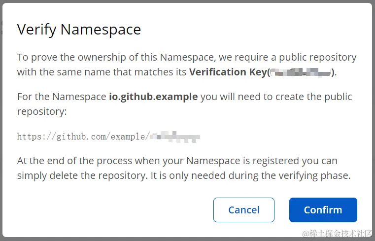 - 在 example 账户下创建域验证密钥同名的公共仓库,然后点击上图中的 Confirm 按钮即可。