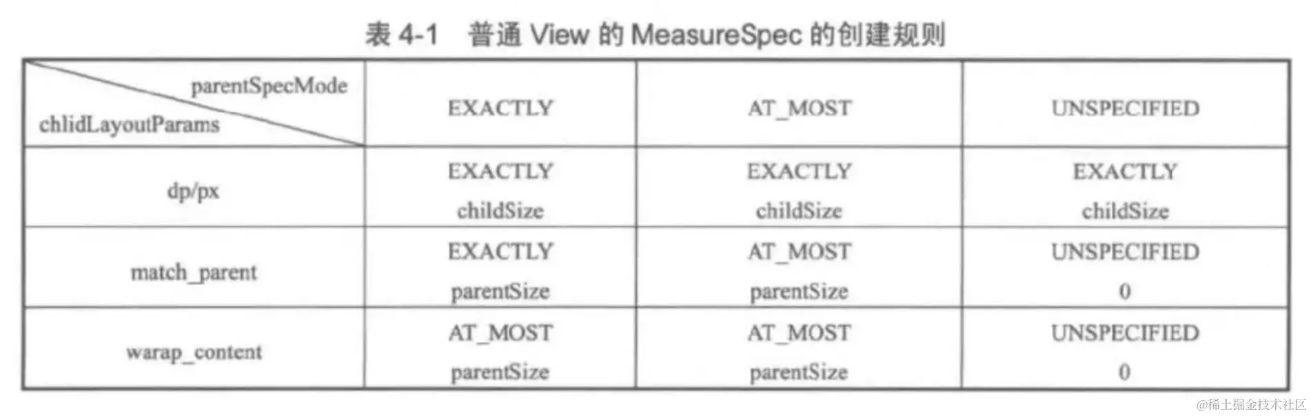 对于DecorView而言,它的MeasureSpec由窗口尺寸和其自身的LayoutParams共同决定;对于普通的View,它的MeasureSpec由父视图的MeasureSpec和其自身的LayoutParams共同决定。