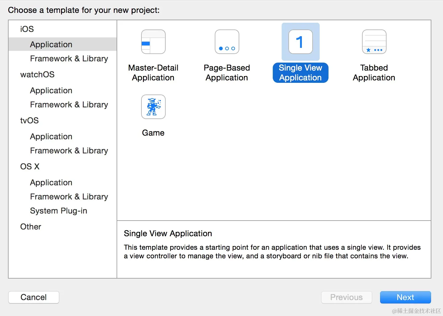 2、我们选择一个"Single View Application",并点击"next",创建一个简单示例app应用。