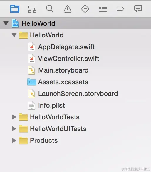 5、项目创建后,默认生成了一个示例文件,可以看到swift将oc中的h和m文件合并成了一个文件(即swift后缀名文件). Main.storyboard相当于xib文件,有比xib更多的功能。