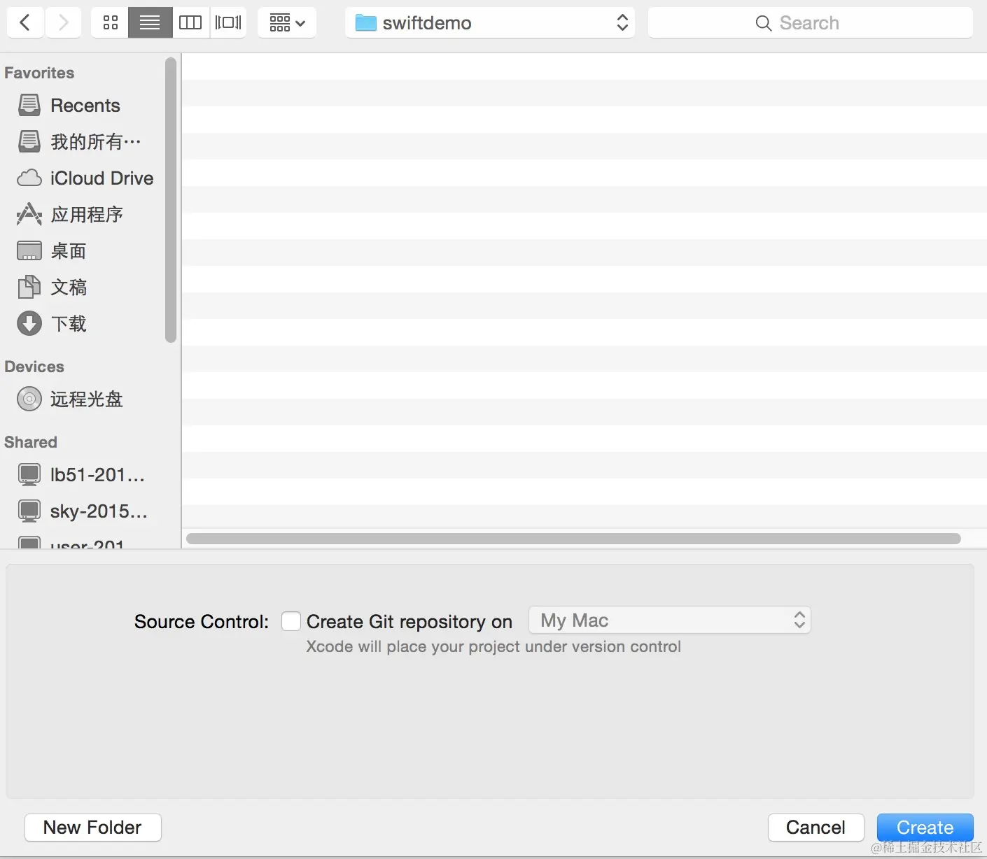 4、选择存放的目录,如果要使用Git源代码管理,将勾上Source Control的create git repository on My Mac. 点击create创建项目。