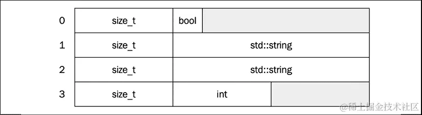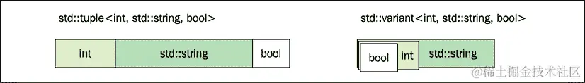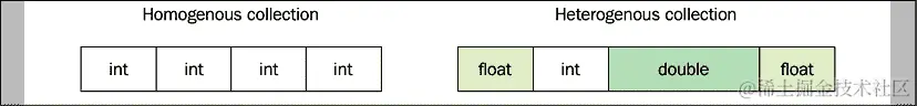C++容器是同类的,意味着它们只能存储单一类型的元素。std::vector<int>存储一组整数,std::list<Boat>中存储的所有对象都是Boat类型。但有时,我们需要跟踪不同类型的元素集合。我将这些集合称为异类集合。在异类集合中,元素可能具有不同的类型。下图显示了一个整数的同类集合的示例和一个具有不同类型元素的异类集合的示例: