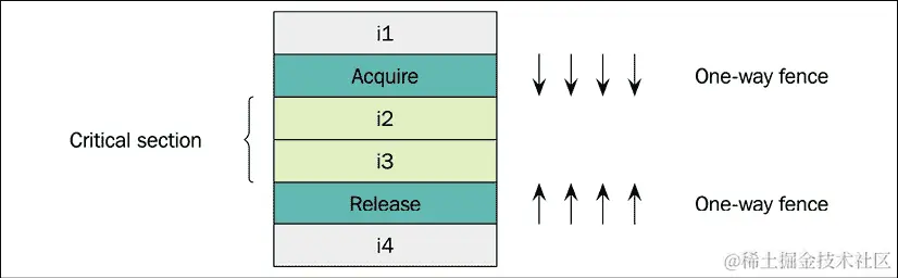 在获取互斥锁时,我们创建了一个获取内存栅栏。它告诉系统不能将内存访问(读取或写入)移动到获取栅栏所在的线以上。系统可以将 i4 指令移动到释放栅栏之上,超过 i3 和 i2 指令,但不能超过获取栅栏。