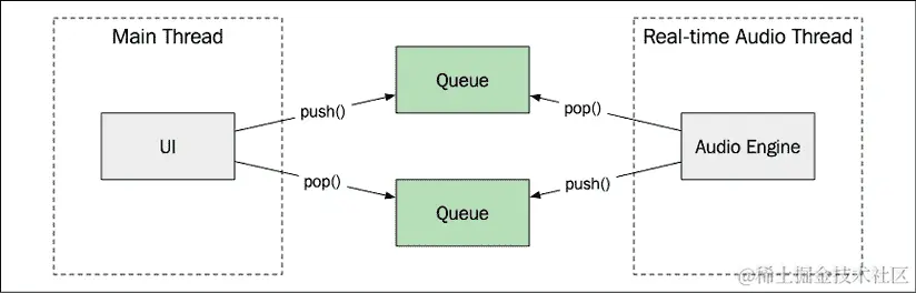 图 11.15:使用两个无锁队列在主线程和实时音频线程之间传递状态