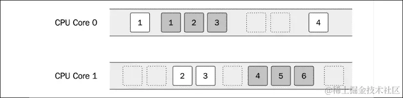 线程亲和性使得调度程序可以提示哪些线程可以受益于共享相同的 CPU 缓存。换句话说,这是对调度程序的请求,如果可能的话,一些线程应该在特定的核心上执行,以最小化缓存未命中。