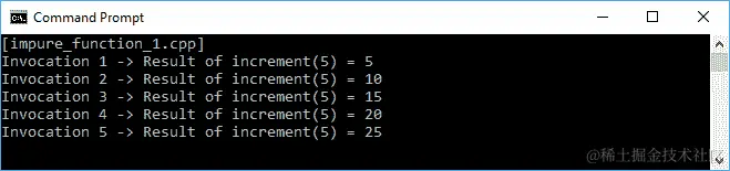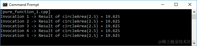 上述代码来自pure_function_1.cpp,但我们添加了一个全局状态phi。如果我们运行上述代码,我们肯定会得到与pure_function_1.cpp相同的结果。尽管函数在五次调用中返回相同的结果,但im_pure_function_1.cpp中的circleArea()不是一个纯函数,因为它依赖于phi变量。