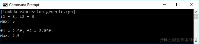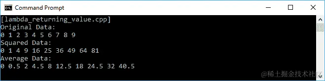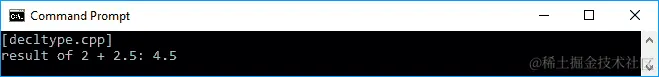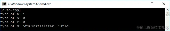 正如我们在前面的代码中看到的,我们有一个将存储整数值的变量a,并且有一个将存储双精度值的变量b。我们计算a和b的加法,并将结果存储在变量c中。在这里,我们期望c将存储双精度对象,因为我们添加了整数和双精度对象。最后是将存储initializer_list<double>数据类型的变量d。当我们运行前面的代码时,将在控制台上看到以下输出: