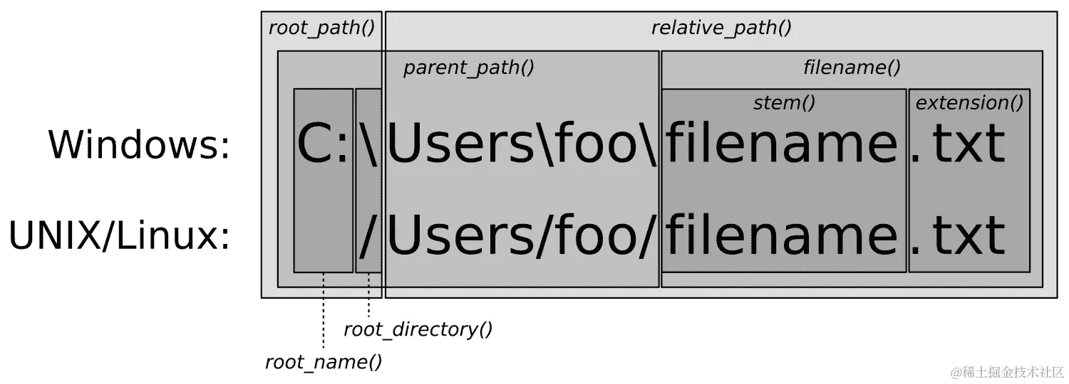作为std::filesystem的入门,这个示例仍然相当简短和直接。我们从包含文件系统路径描述的字符串初始化了一个path对象。std::filesystem::path类在我们使用文件系统库时扮演着非常重要的角色,因为大多数函数和类都与它相关。