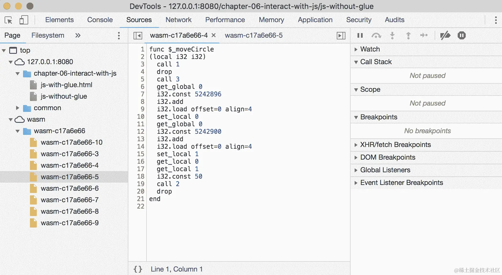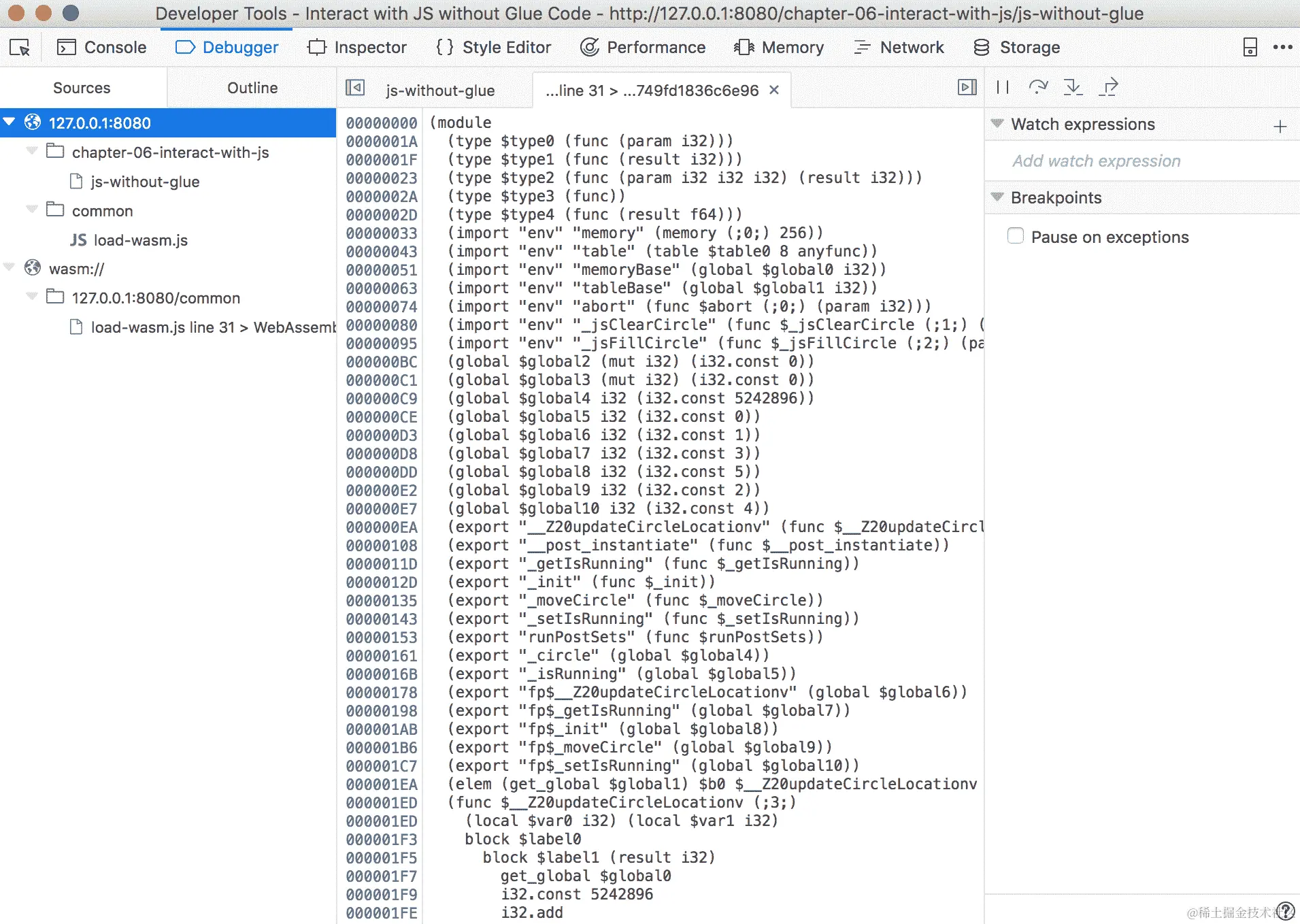 我们在第四章 安装所需的依赖项中向emcc命令传递的标志产生了一个单一的.wasm文件,可以使用本机的WebAssembly对象在浏览器中加载和实例化。C 代码是一个非常简单的示例,旨在测试编译器,而无需考虑包含的库或 WebAssembly 的限制。通过利用 Emscripten 的一些功能,我们可以克服 C/C++代码的一些 WebAssembly 的限制,而只有最小的性能损失。