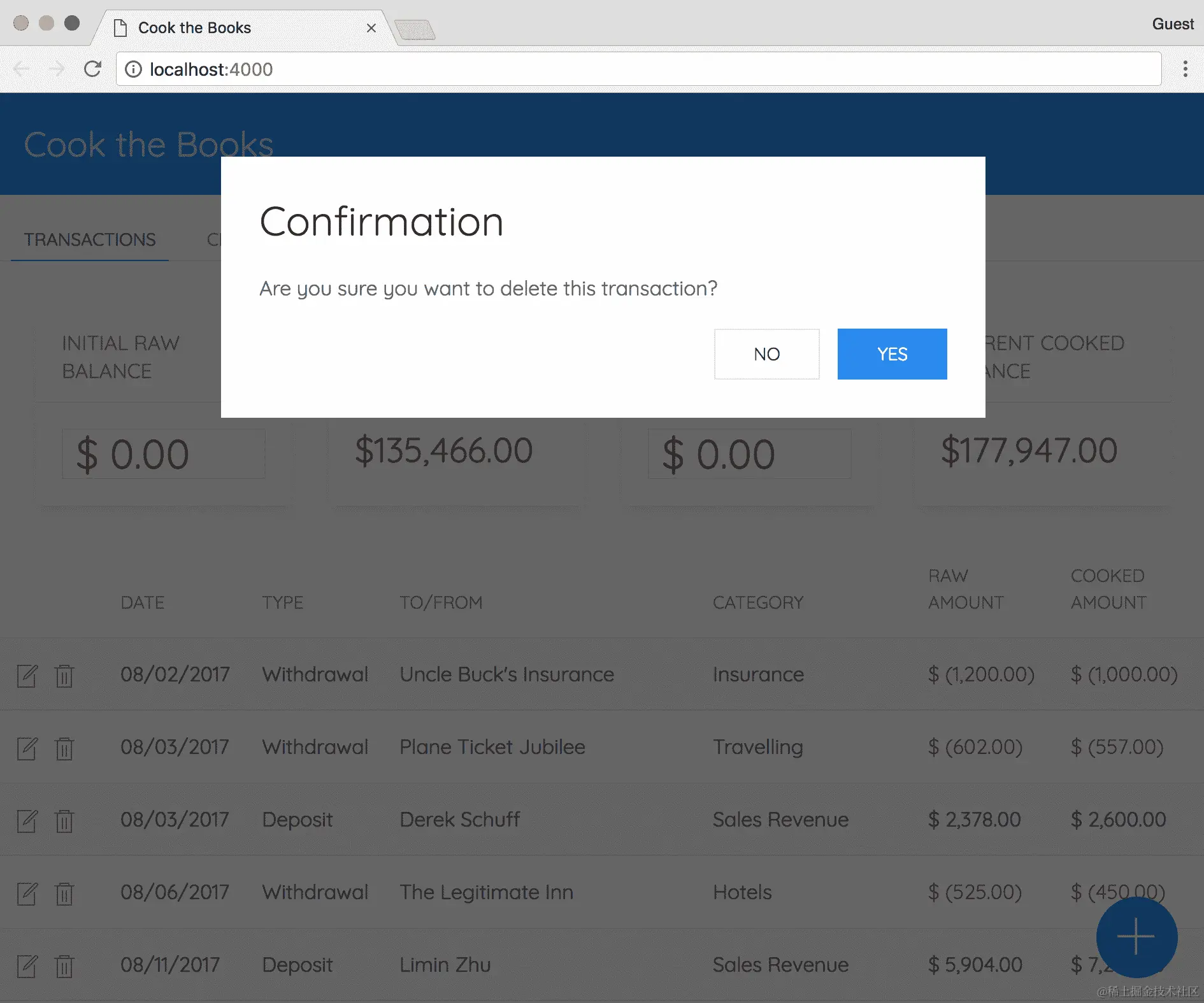 在TransactionsTable组件中选择一行,注意金额,然后按下该记录的垃圾桶按钮。ConfirmationModal组件应该出现。当您按下是按钮时,交易记录应该不再出现在表中,并且当前余额应该更新以反映与已删除交易相关的金额,如下截图所示: