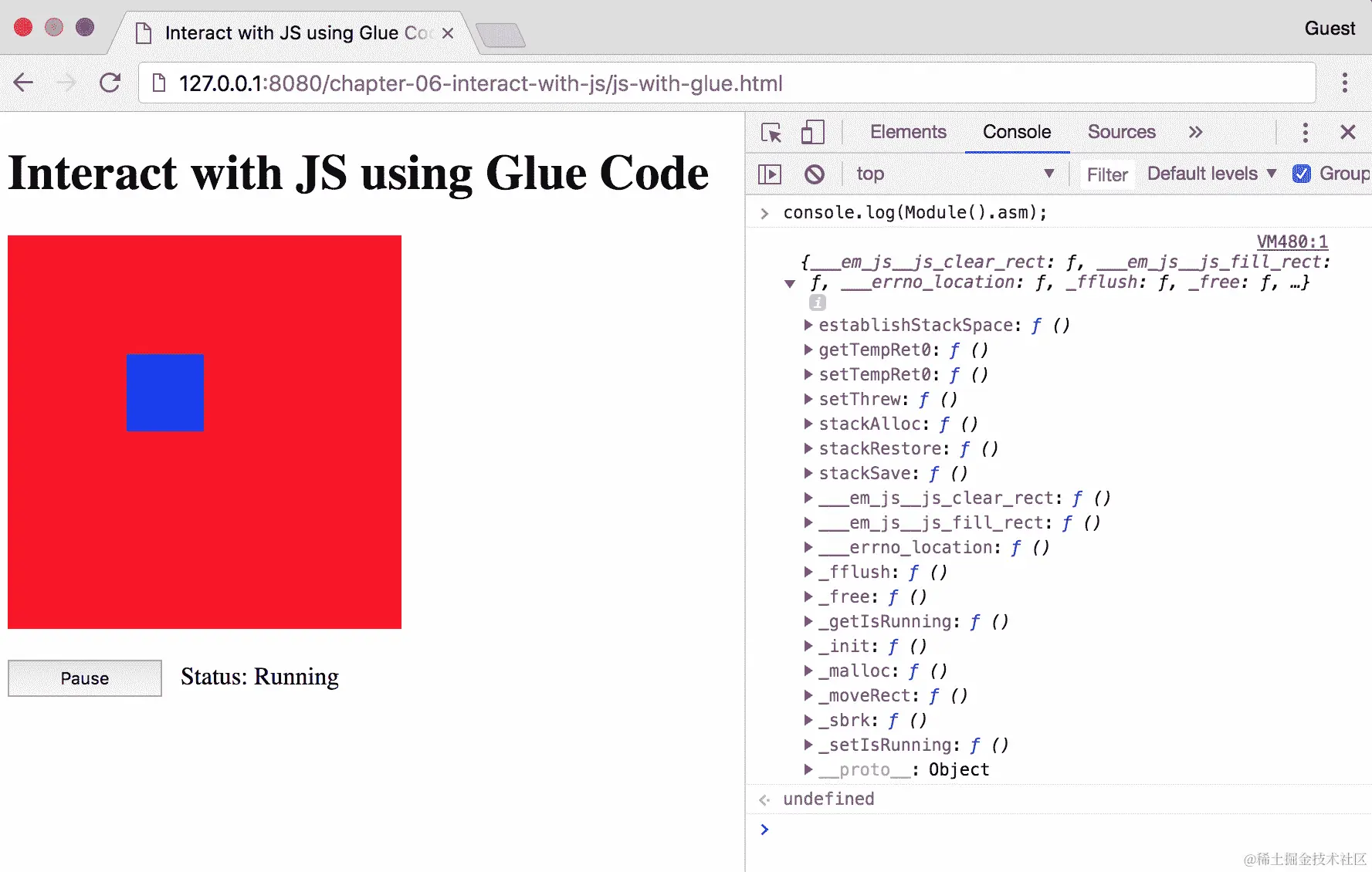 以下程序使用Simple DirectMedia Layer(SDL2)在画布上对角移动一个矩形的无限循环。它取自github.com/timhutton/sdl-canvas-wasm,但我将其从 C++转换为 C 并稍微修改了代码。本节的代码位于learn-webassembly存储库的/chapter-05-create-load-module文件夹中。按照以下说明使用 Emscripten 编译 C。