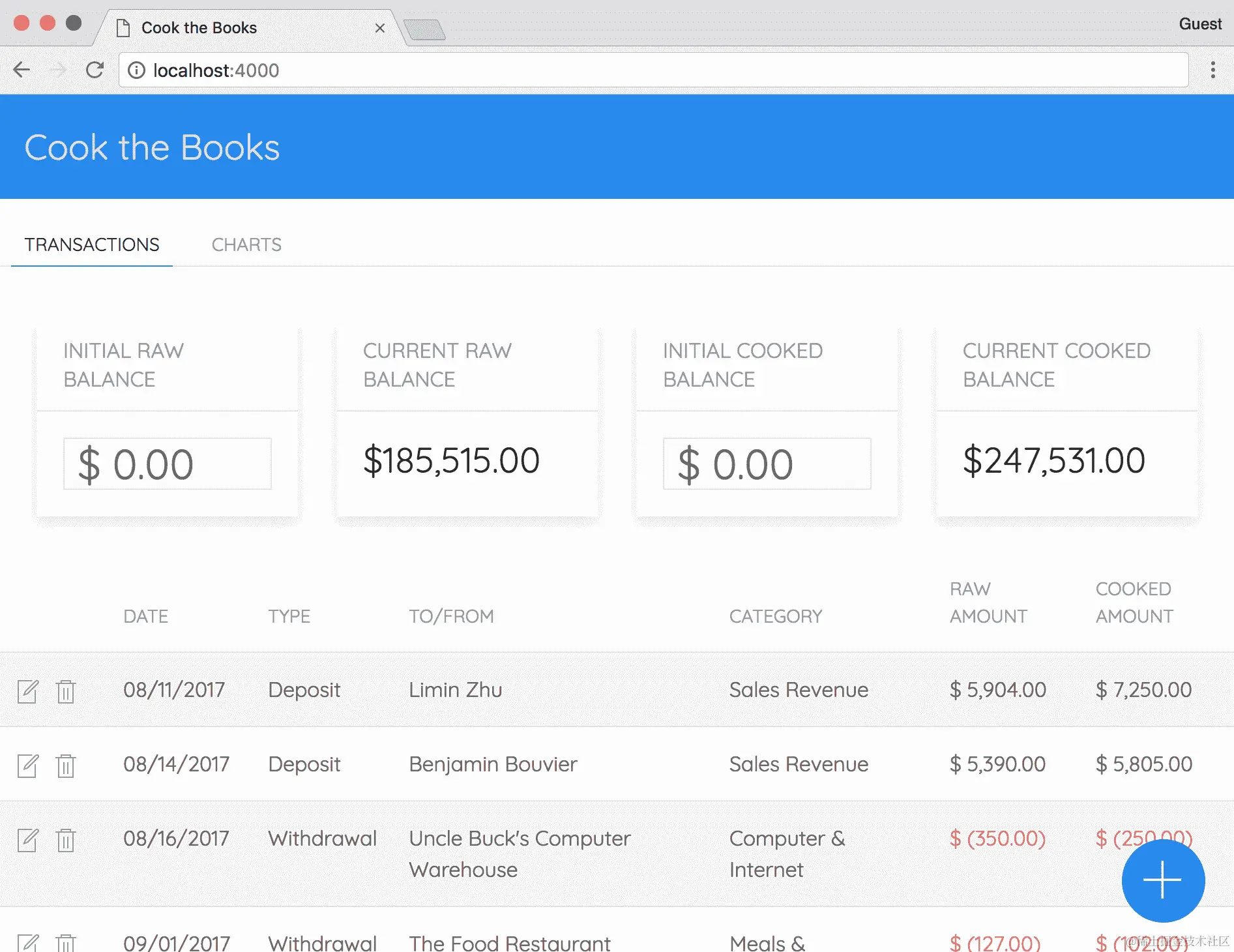 记下当前的原始和处理后的余额,然后按下窗口右下角的蓝色添加按钮。它应该加载TransactionModal组件。填写输入,记下类型,原始金额和处理后的金额,然后按保存按钮。