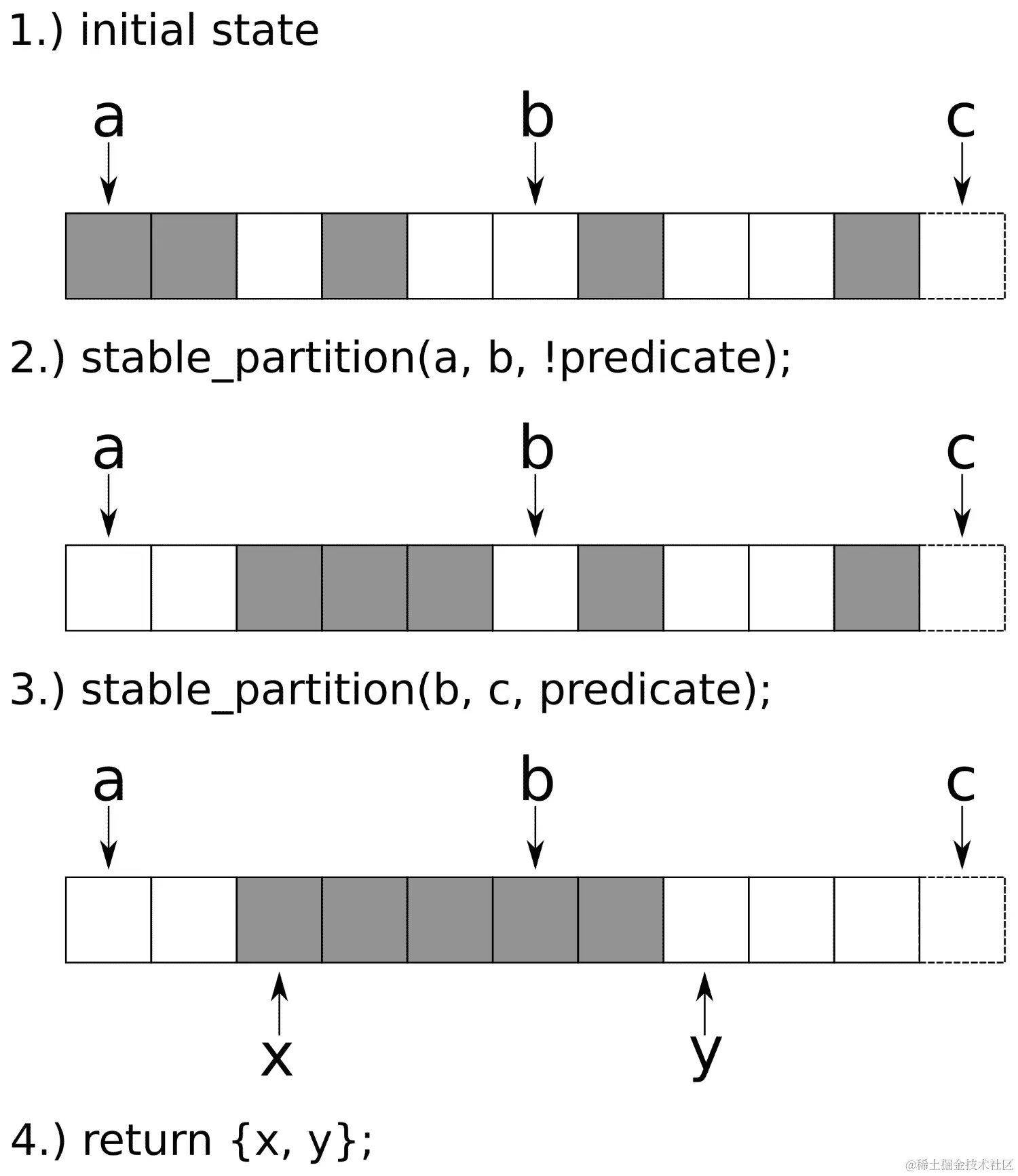 想象一下字符范围"aabb",以及一个谓词函数is_character_a,它只对'a'项为真--如果我们用一个指向字符范围中间的第三个迭代器调用它,我们会观察到相同的错误。原因是第一个stable_partition调用将在子范围"aa"上操作,而另一个stable_partition调用将在范围"bb"上操作。这一系列的调用不能导致最初我们天真地希望的"baab"。