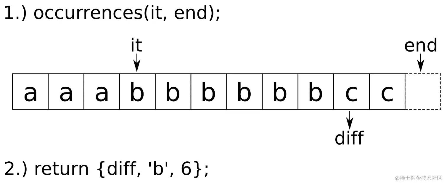 occurences函数接受两个参数:指向范围内字符序列开头的迭代器和该范围的结束迭代器。使用find_if,它找到第一个与最初指向的字符不同的字符。在图表中,这是迭代器diff。新位置和旧迭代器位置之间的差异就是相等项的数量(在图表中,diff - it等于6)。计算出这些信息后,diff迭代器可以被重用以执行下一次搜索。因此,我们将diff、子范围的字符和子范围的长度打包到一个元组中并返回它。