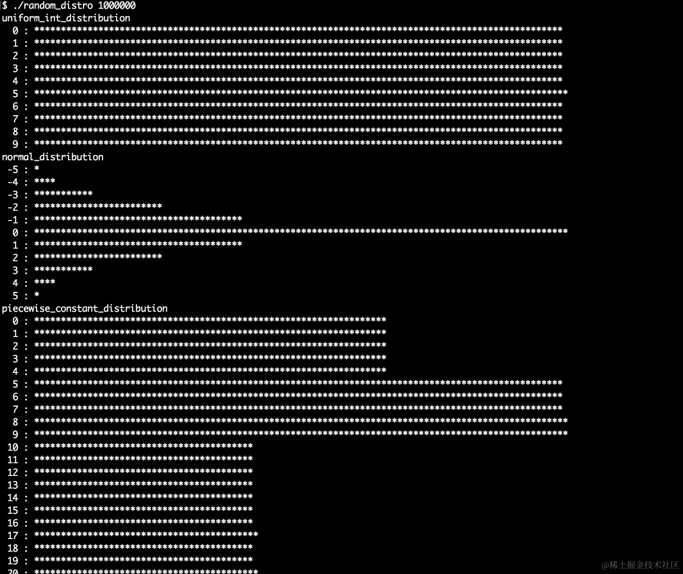 - 编译和运行程序产生以下输出。让我们首先以每个分布