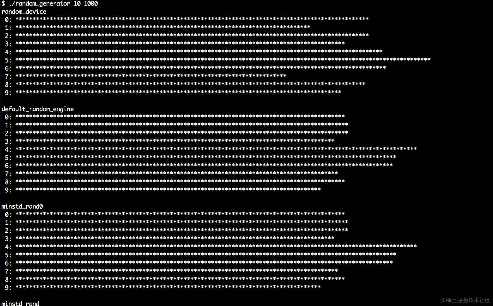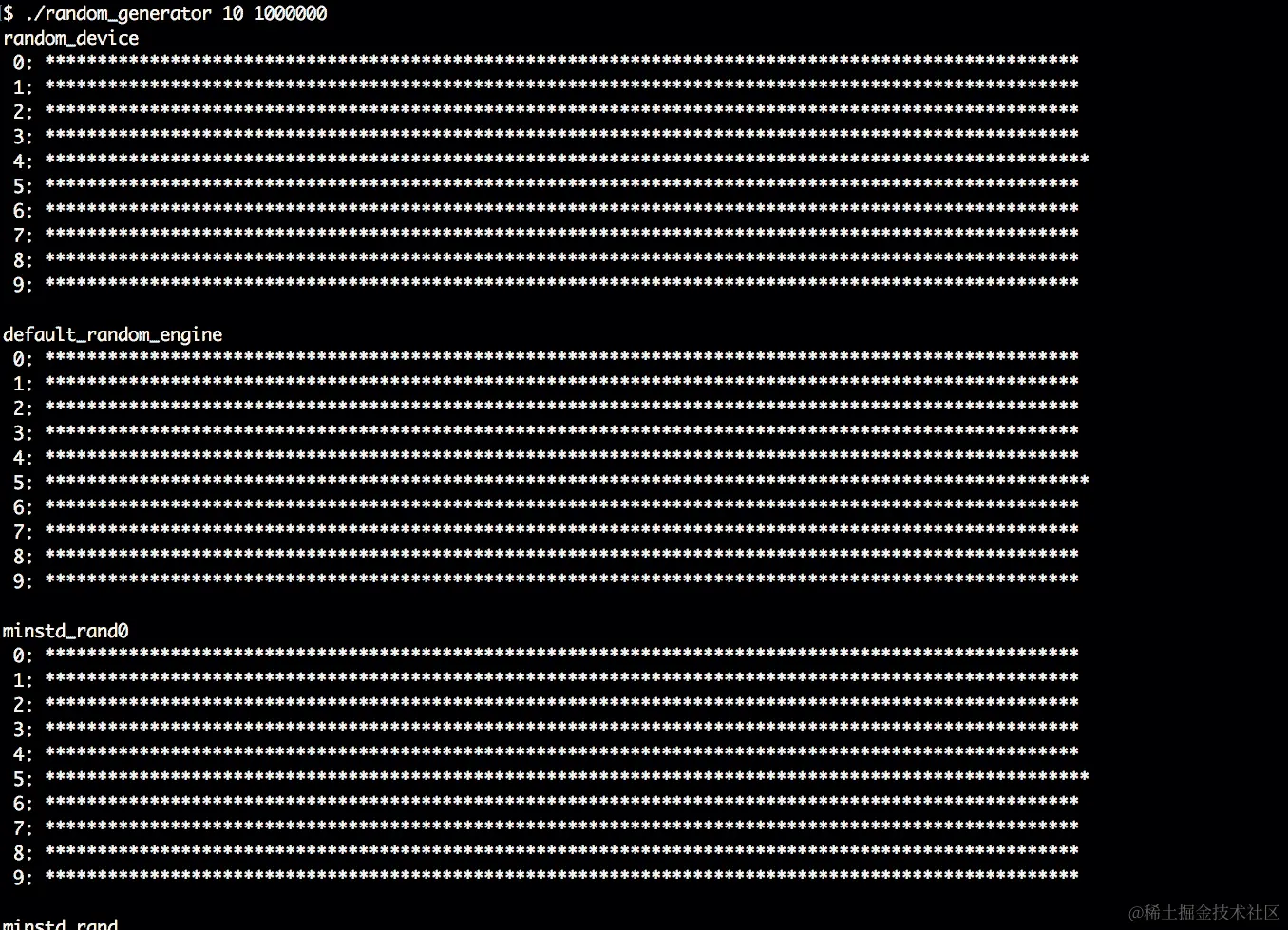 '*'的条形。我们放弃其他计数器,因为一些分布引擎将数字分布在如此大的域上,以至于它会完全淹没我们的终端窗口:
