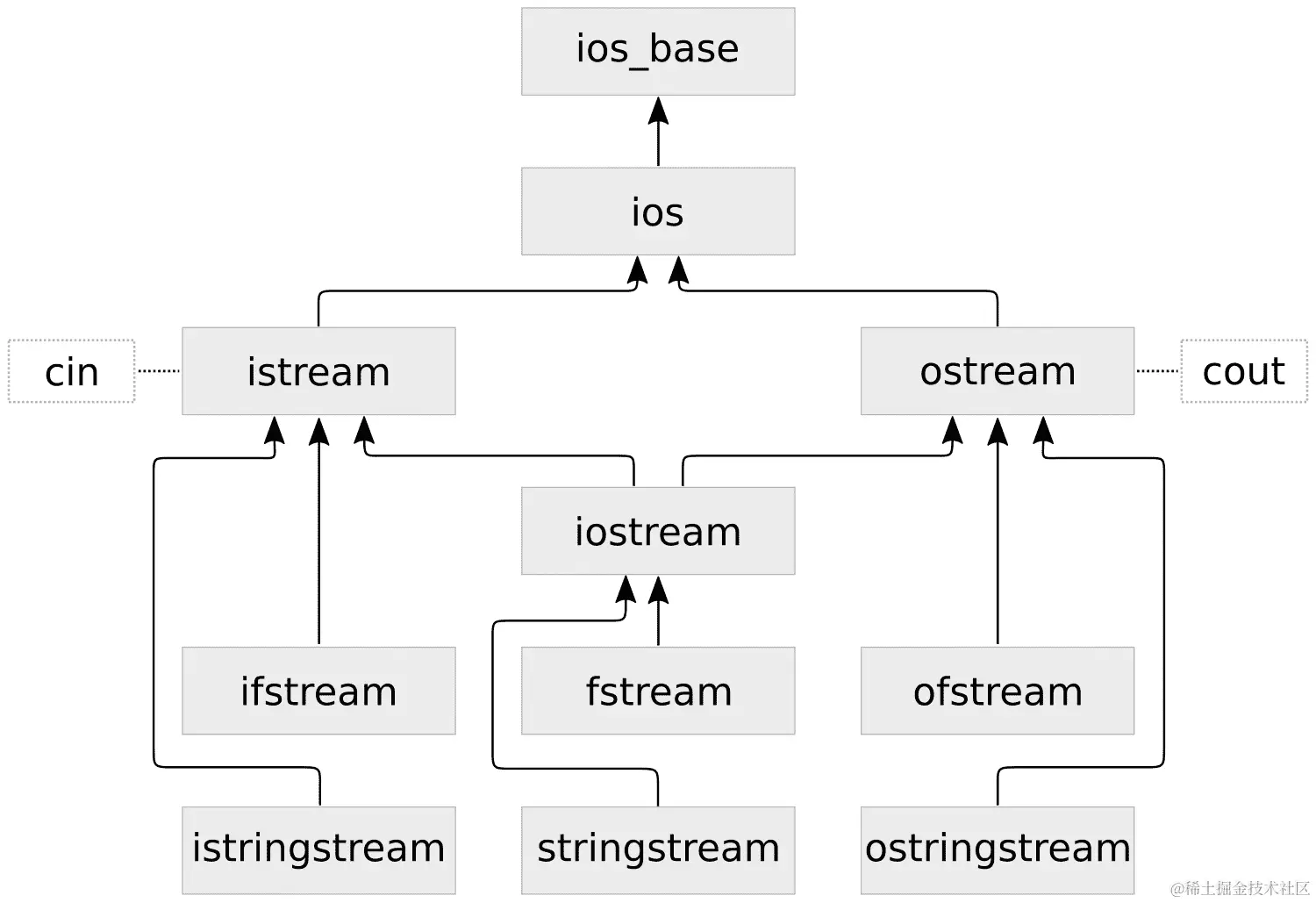 在图表的顶部,我们看到std::ios_base。我们基本上永远不会直接使用它,但它被列出是为了完整性,因为所有其他类都继承自它。下一个特化是std::ios,它体现了维护数据流的对象的概念,可以处于良好状态、运行空数据状态(EOF)或某种失败状态。