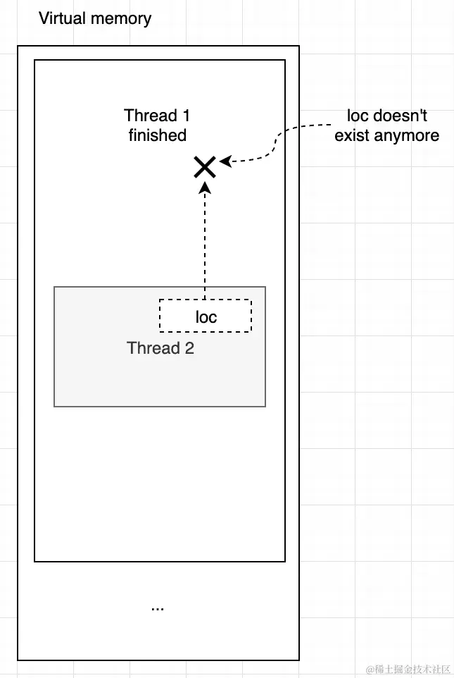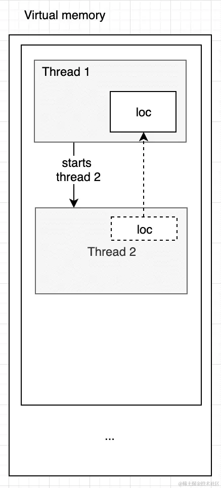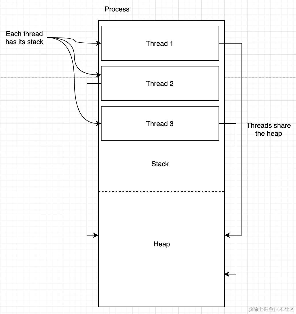 然而,线程不共享堆栈。每个线程都有自己的堆栈部分。这种隔离的原因在于,线程只是一个函数,函数本身应该可以访问堆栈来管理其参数和局部变量的生命周期。当我们将相同的函数作为两个(或更多)分别运行的线程运行时,运行时应该以某种方式处理它们的边界。虽然这很容易出错,但你可以通过值或引用将一个变量从一个线程传递到另一个线程。假设我们启动了三个线程,分别运行上面例子中的三个向量的process_vector()函数。你应该想象启动一个线程意味着以某种方式复制底层函数(它的变量但不是指令)并将其独立地运行。在这种情况下,相同的函数将被复制为三个不同的图像,并且每个图像都将独立于其他图像运行,因此每个图像都应该有自己的堆栈。另一方面,堆在线程之间是共享的。因此,基本上我们得到了以下结论: