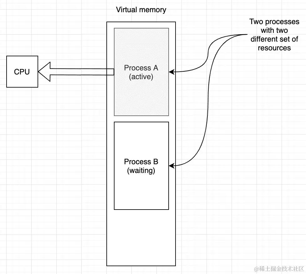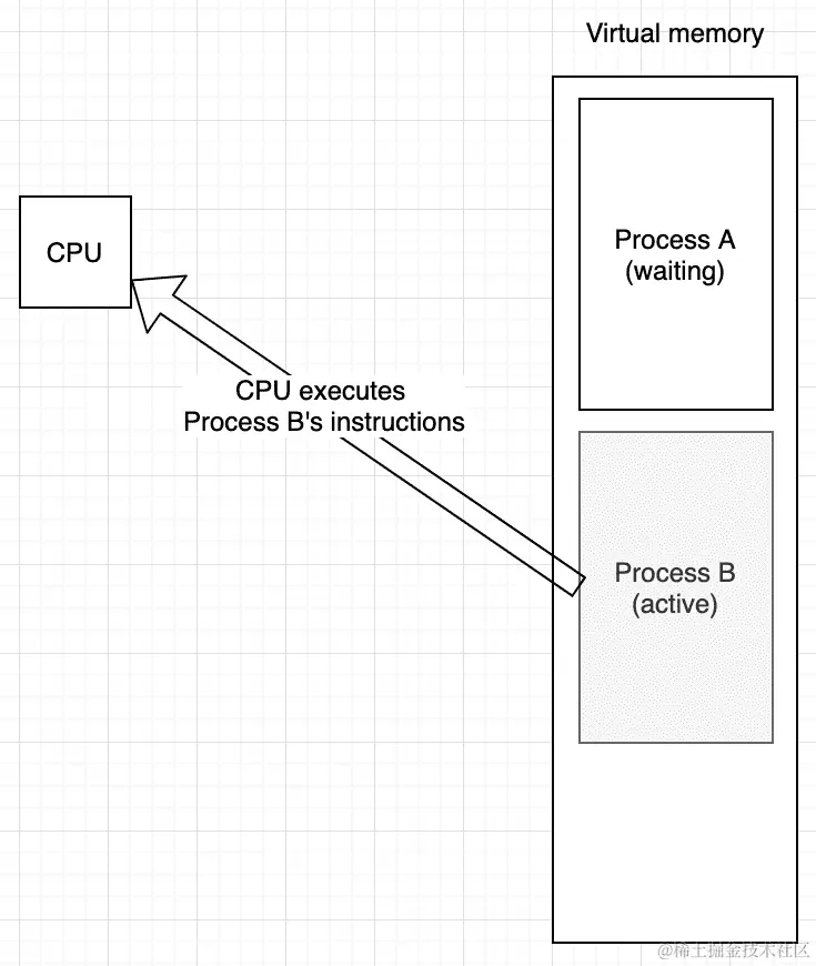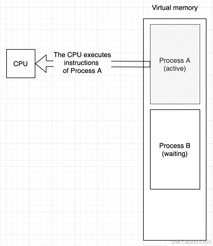 有趣的是,这些过程甚至没有意识到这样的事情。所描述的过程发生得如此之快,以至于用户实际上无法注意到操作系统中运行的程序实际上并不是同时运行的。下图描述了由单个 CPU 运行的两个进程。当其中一个进程处于活动状态时,CPU 按顺序执行其指令,将任何中间数据存储在其寄存器中(你也应该考虑缓存内存,就像在游戏中一样)。另一个进程正在等待操作系统提供其运行的时间段: