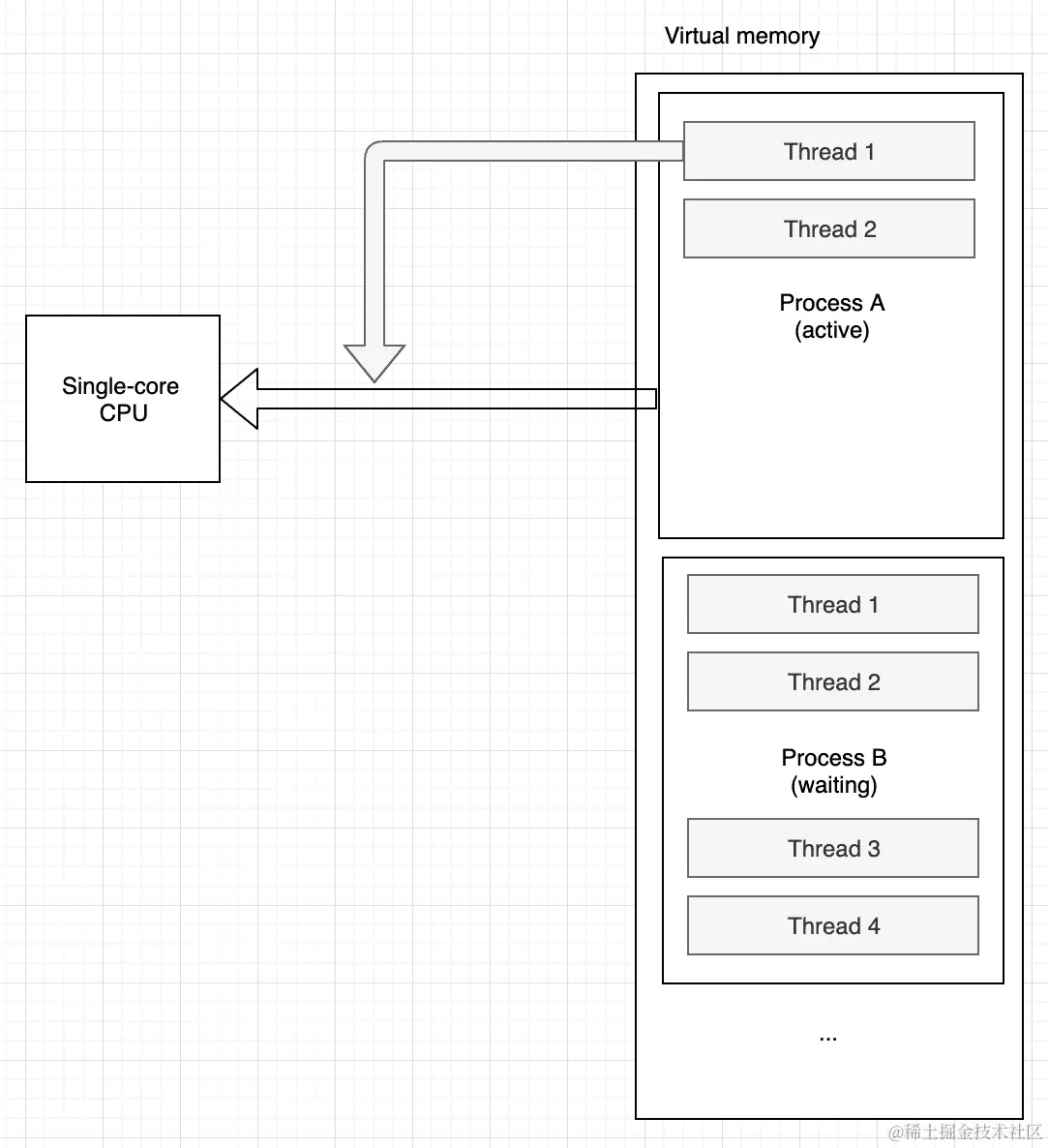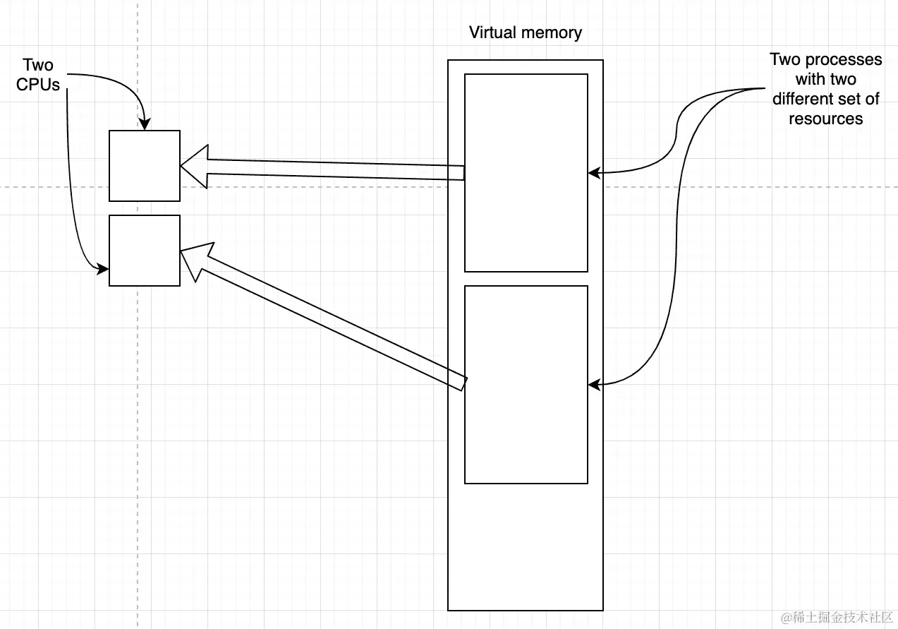 计算机系统中的 CPU 数量定义了真正并行运行的进程数量。这在下图中显示: