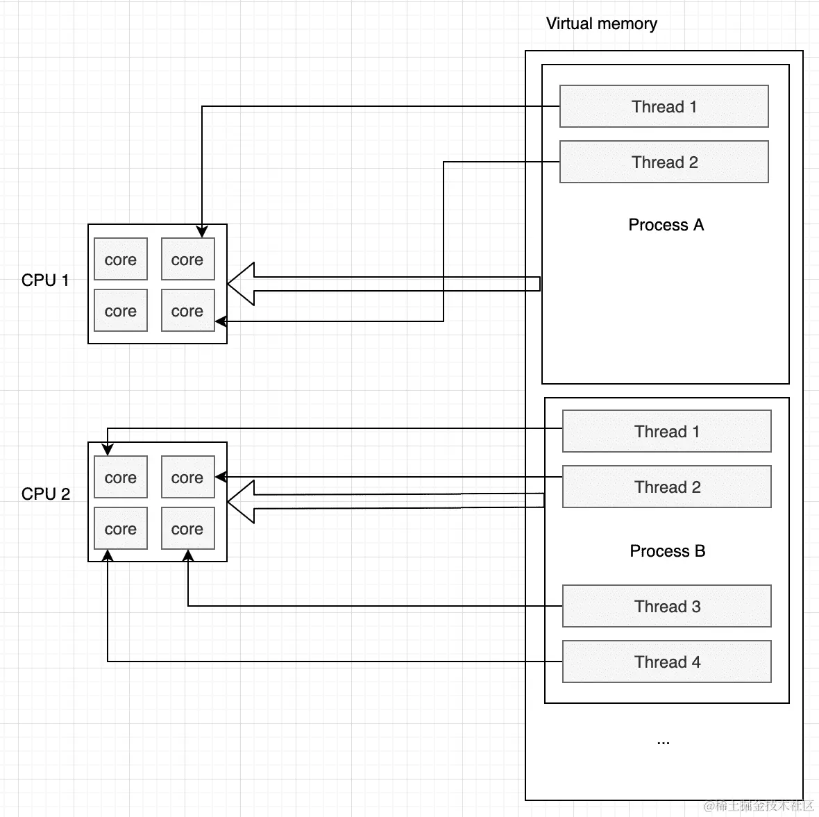 下图描述了两个 CPU,每个 CPU 都有四个核心。每个核心可以独立地运行一个线程: