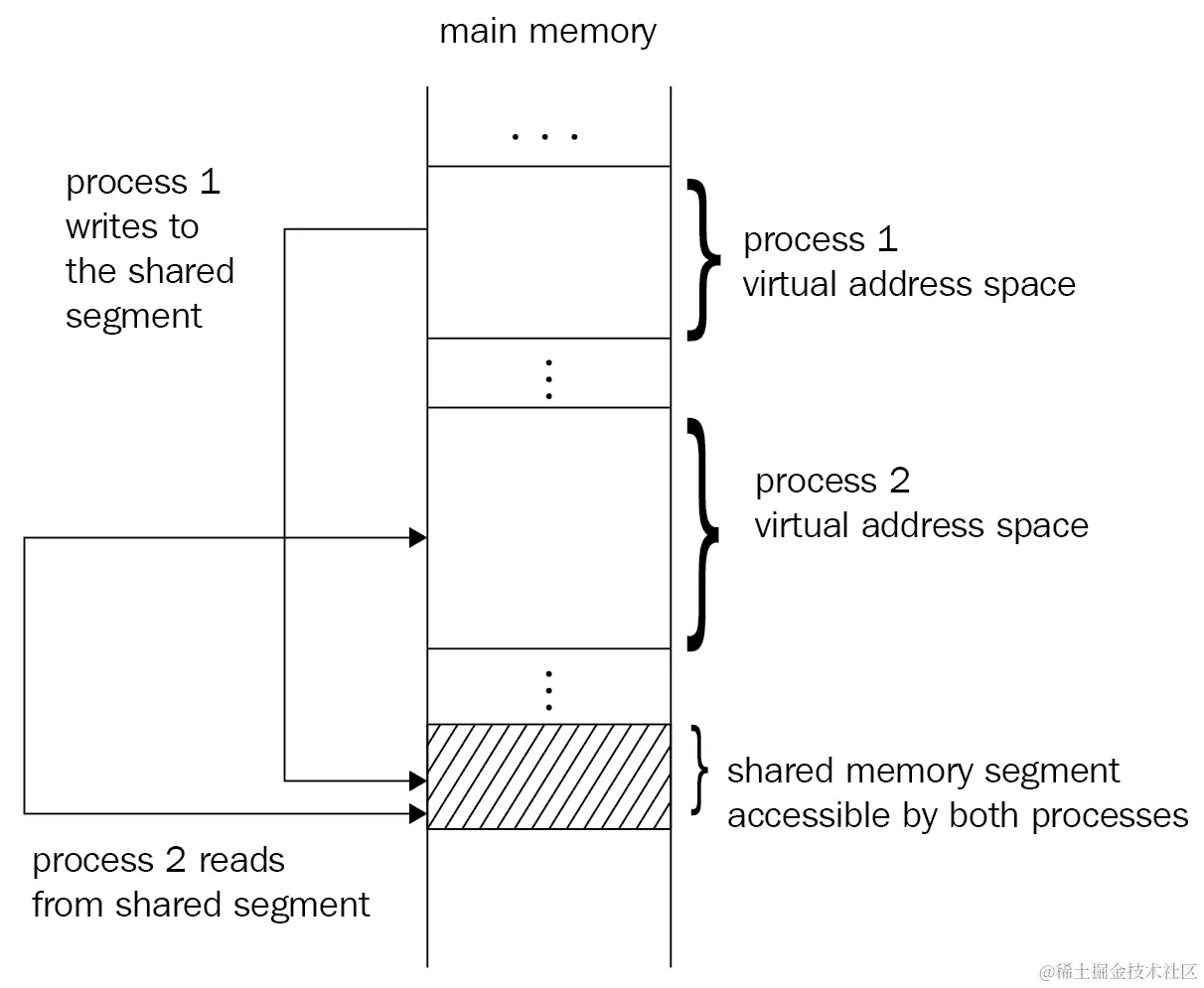 当进程需要以某种方式相互联系时,困难就会出现。比如,一个进程应该计算某些东西并将值传递给一个完全不同的进程。有几种方法可以实现 IPC,其中一种是使用在进程之间共享的内存段。下图描述了两个进程访问共享内存段的情况: