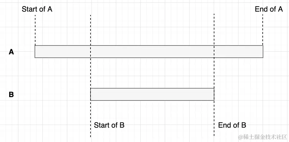 并发通常与多线程混淆。它们在性质上是相似的,但在细节上是不同的概念。为了简化问题,只需想象并发是两个操作的运行时间交错在一起。如果操作A与操作B同时运行,它们的开始和结束时间在任何时刻都是交错的,如下图所示: