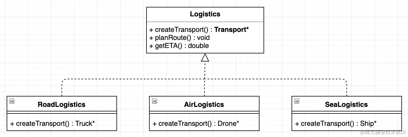 这是工厂模式的基础,因为例如RoadLogistics覆盖了getLogistics(),如下所示: