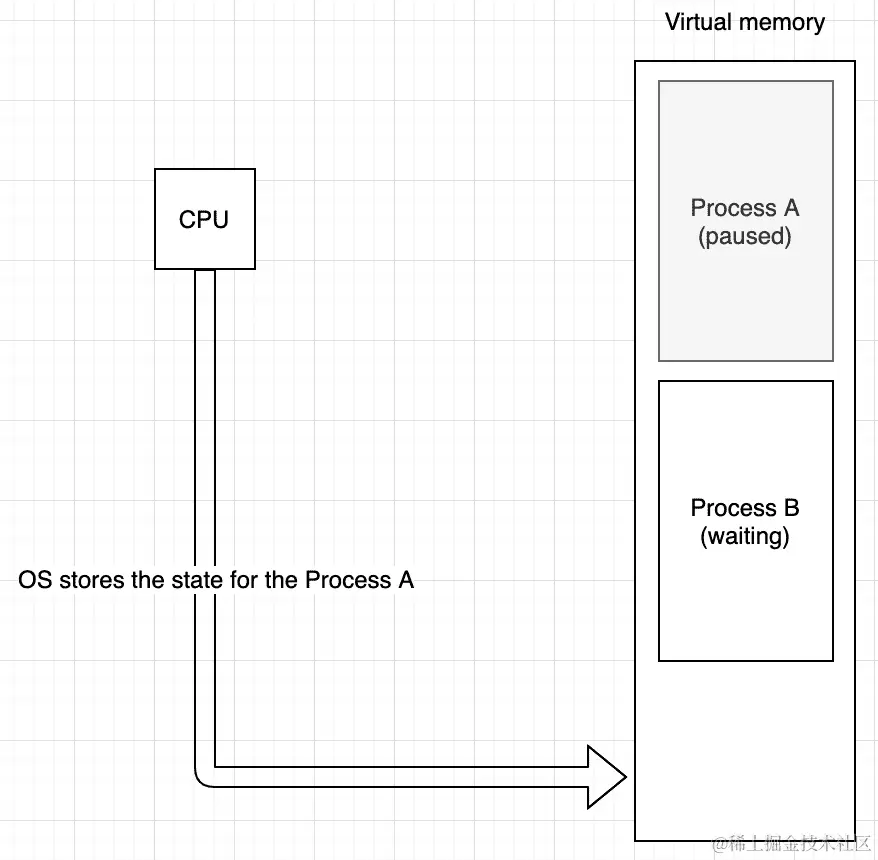 显然,如果进程 B之前正在运行,它的状态应该被加载回 CPU。同样,当进程 B的时间片(或时间量子)用完时,操作系统会存储它的状态,并将进程 A的状态加载回 CPU(在被操作系统暂停之前的状态):