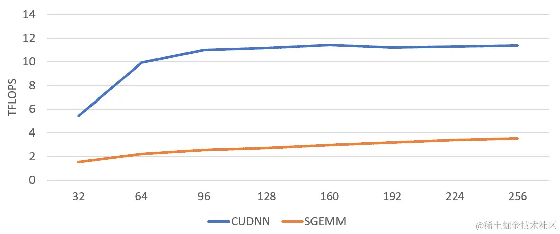 以下图表显示了来自 Tesla V100 卡的 cuBLAS 和 cuDNN 的性能: