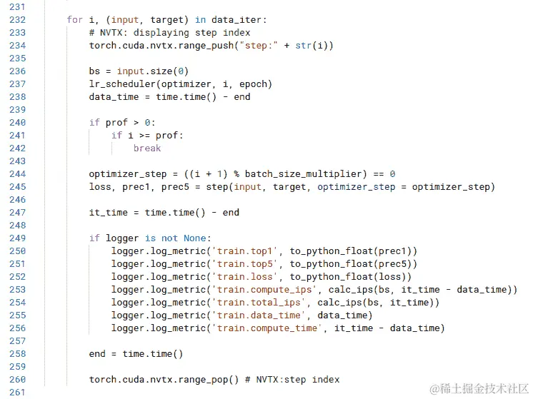 train()函数中的训练循环中放置 NVTX 注释以注释step值。该函数可以在image_classificaiton/training.py文件中找到。以下截图显示了训练循环和分别在第 234 行和第 260 行的 NVTX 注释: