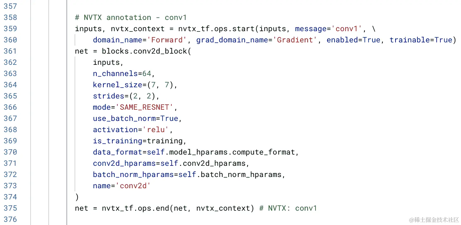 model_build()函数可以在model/resnet_v1_5.py文件的ResnetModel类中找到。以下代码显示了如何在model_build()函数中的conv1层上使用 Python 函数放置 NVTX 注释的示例: