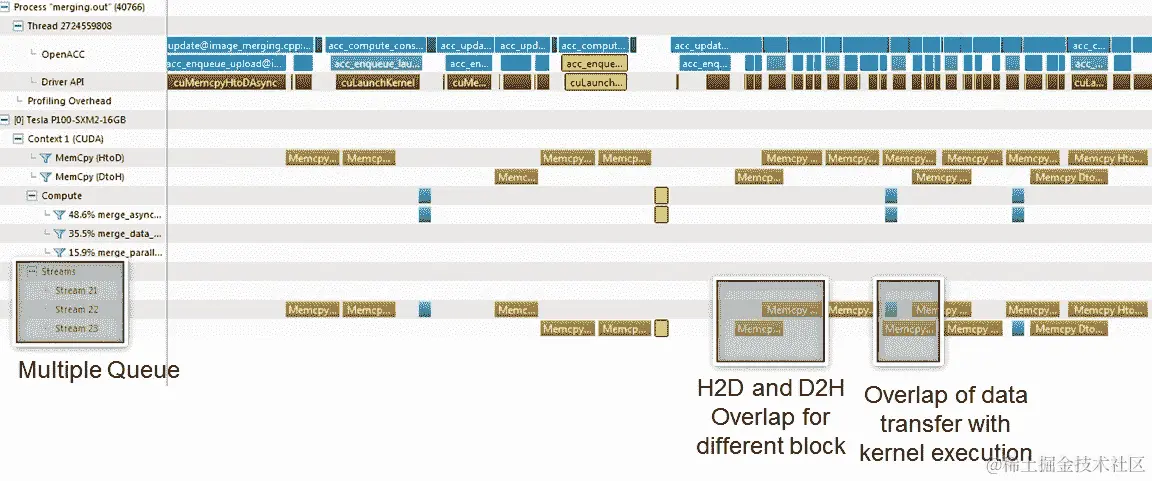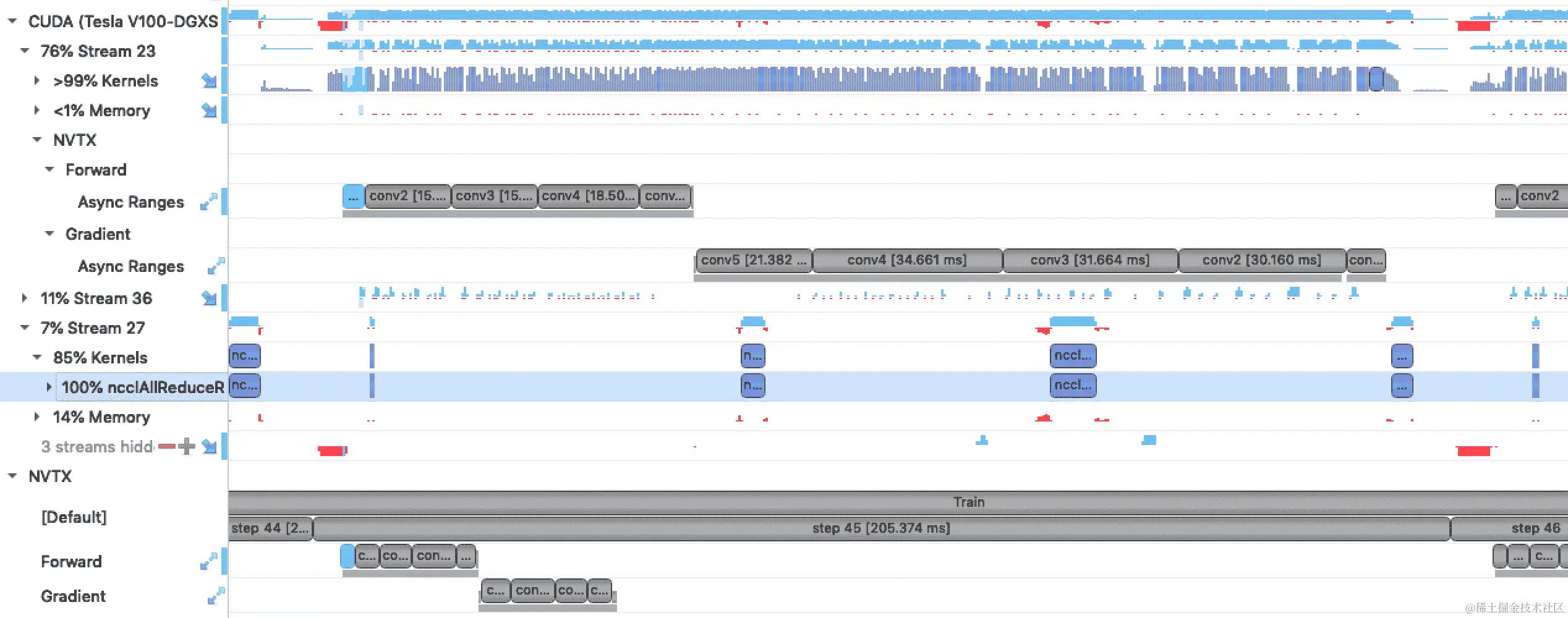 使用 NVIDIA Nsight Systems 进行性能分析在多 GPU 训练中监视所有归约操作的执行时间时提供了额外的好处。以下截图显示了一个使用两个 GPU 进行训练的 GPU 的性能分析结果: