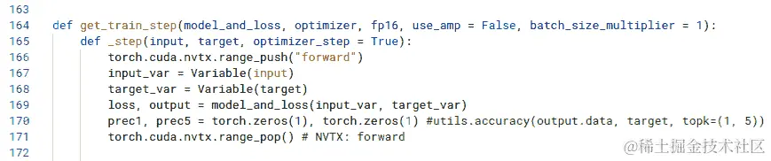 get_train_step()函数中添加一些 NVTX 注释。该函数返回_step()函数,其中包括训练操作。因此,我们将在该函数中放置 NVTX 注释。训练过程包括前向和反向传播、全局归约和优化(更新权重)。以下截图显示了在第 166 行和第 171 行的前向传播的注释: