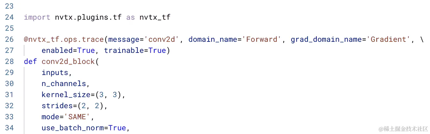 TensorFlow 图形 API 是符号 API,因此它们需要特定的编程方法。 NVTX 插件为此提供了两个选项:装饰器和 Python 函数。