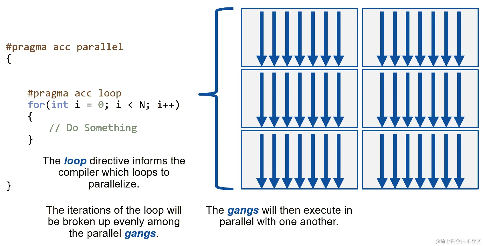 acc是我们 pragma 的一个补充。它指定这是一个 OpenACC pragma。任何非 OpenACC 编译器都会忽略此 pragma。 -