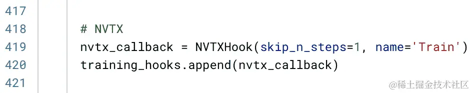 NVTXHook应用于估算器。训练图的定义可以在runtime/runner.py文件的第 312 行找到。在构建图之前,我们将NVTXHook附加到钩子列表中,如下面的代码块所示: