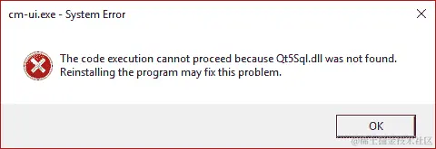 正如您所看到的,windeployqt是一个巨大的时间节省器,但不幸的是,它并不是一个万能解决方案,有时会漏掉所需的文件。存在诸如 Dependency Walker 之类的工具,可以帮助详细分析依赖树,但一个很好的起点就是手动从数据文件夹启动cm-ui可执行文件并查看发生了什么。在我们的情况下,是这样的: