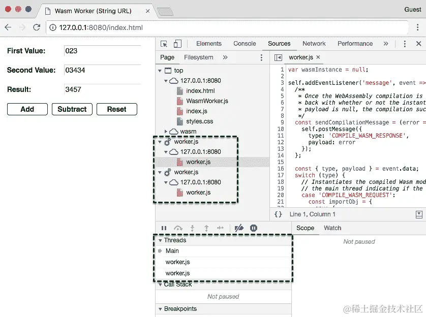 您可以使用浏览器的开发工具设置断点并与工作线程进行交互。在 Google Chrome 中,打开开发者工具并选择“源”选项卡。文件列表面板应包含两个worker.js实例。调试器面板包含一个“线程”部分,其中包含“主”线程和两个worker.js线程。以下屏幕截图显示了 Chrome 开发者工具面板中用于运行应用程序的线程调试元素: