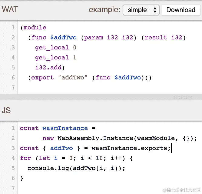 wat2wasm 的 Wat 和 JavaScript 加载代码的“simple”示例