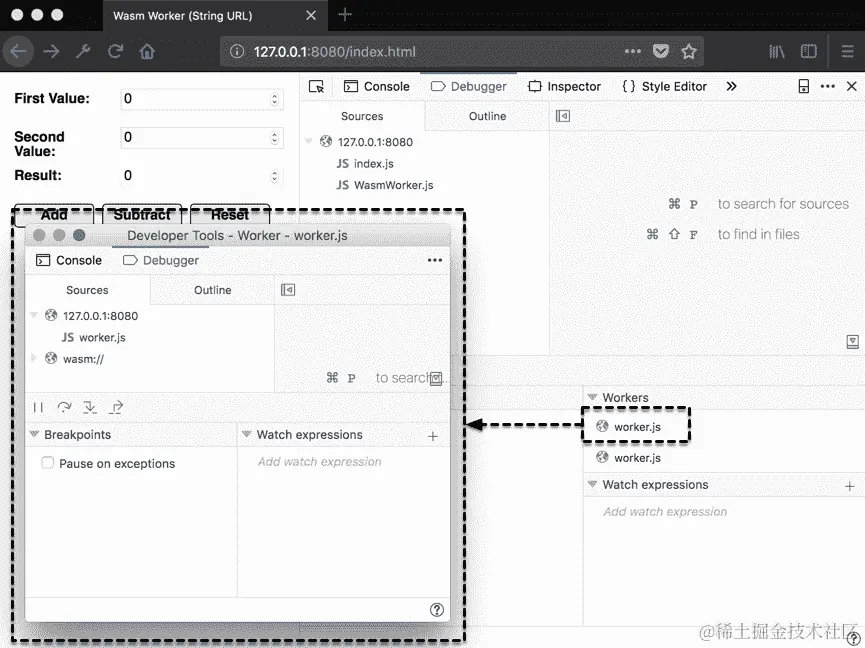 尝试更改第一个值和第二个值输入中的值,然后按“添加”和“减去”按钮。结果输入应该更新为计算结果。如果您导航到http://127.0.0.1:8080/index.html?blob=true,传递给Worker()构造函数的 URL 参数将使用Blob而不是文件名。选项卡应更改以反映使用Blob技术来构造 URL: