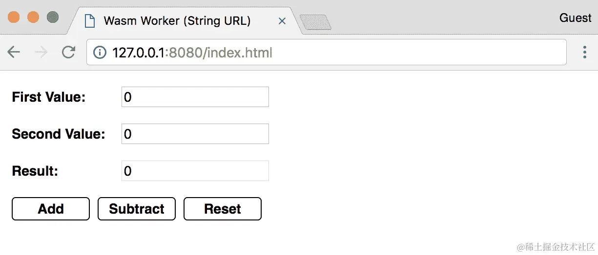 该应用程序由一个带有三个<input>元素和一个包含三个<button>元素的块组成。前两个<input>元素对应于payload中包含的firstVal和secondVal属性,这些属性发送到任一工作线程。最后一个<input>是只读的,并显示任一操作的结果。